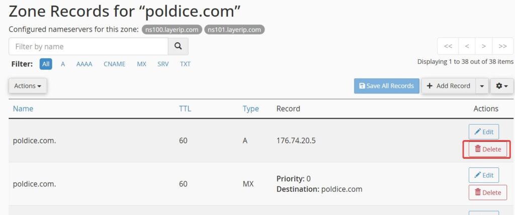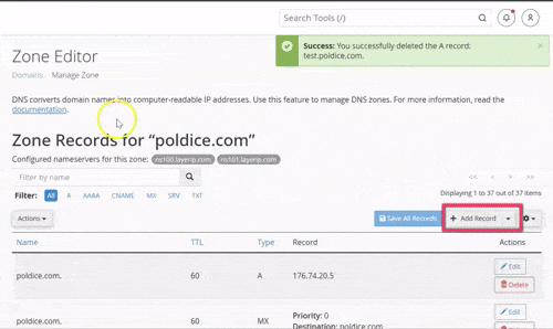- Click the Add Record dropdown and select the type of record you want to add (e.g., A, CNAME, MX).