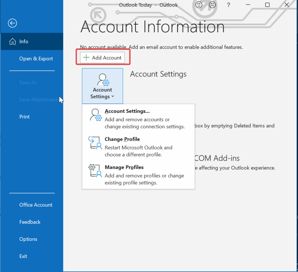 - You can also use Account Settings, then click Account Settings again from the dropdown to add and remove Accounts.