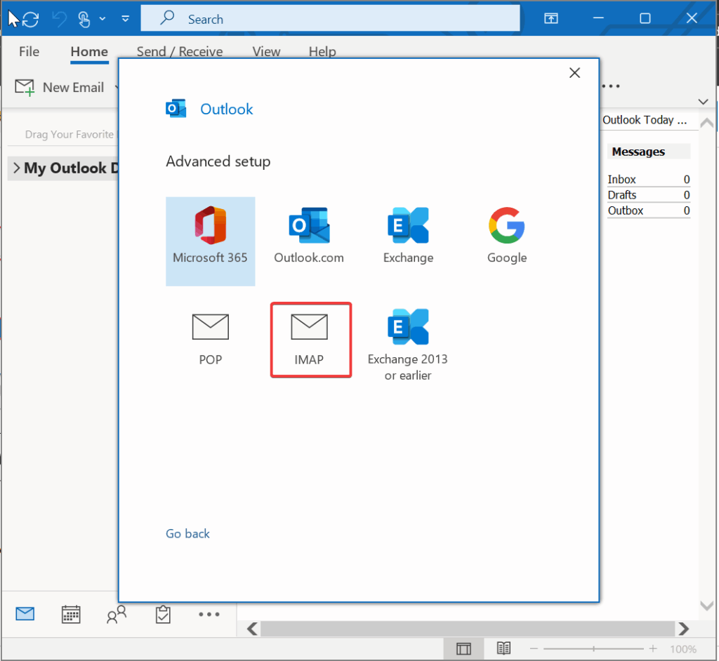 - Choose IMAP option from Advanced Setup