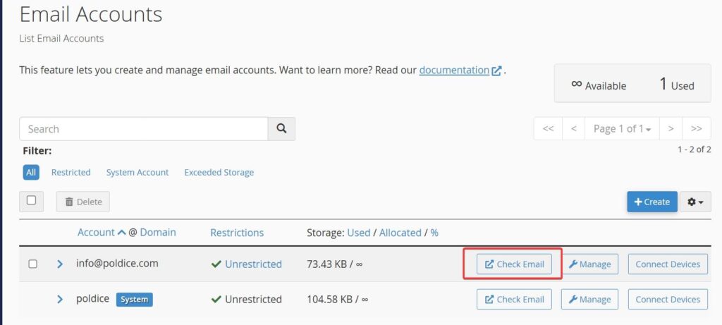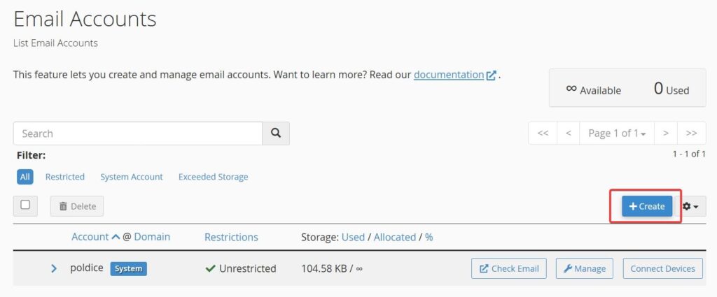 - On the Email Accounts page, click the Create button on the right-hand side.