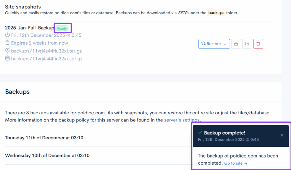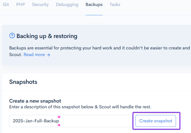 Give your backup a meaningful name in the label box (like “2025-Jan-Full-Backup” or “Pre-Launch”), then click “Create snapshot”.