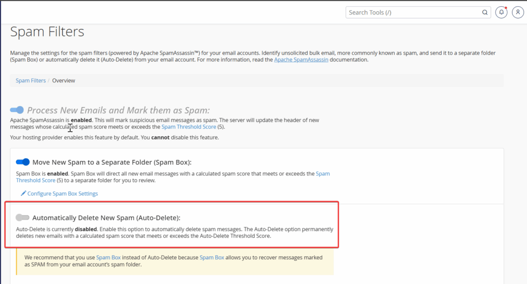Example of Autodelete disabled on Spam Filter Setting