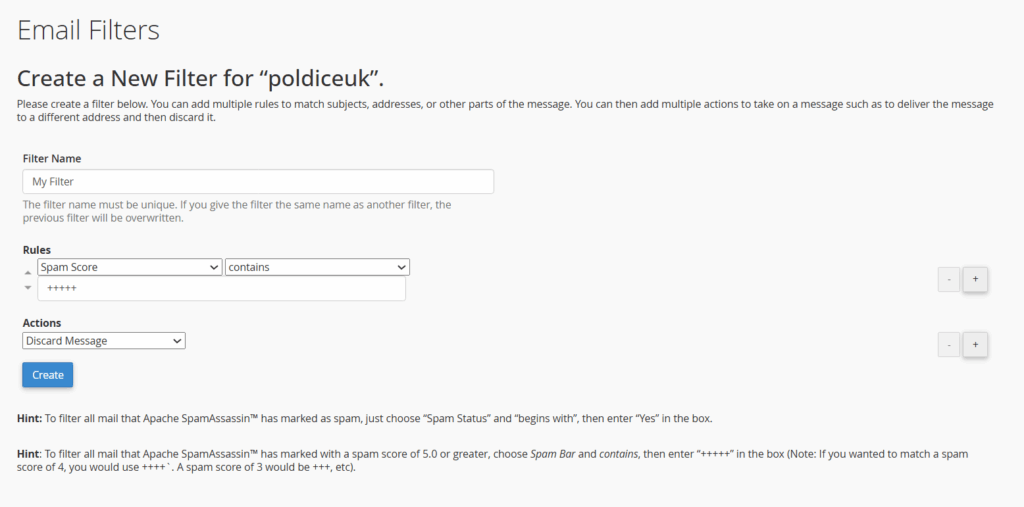 Example Mailbox Email Filter that Discards/Delete received messages that meet spam score 5 and above