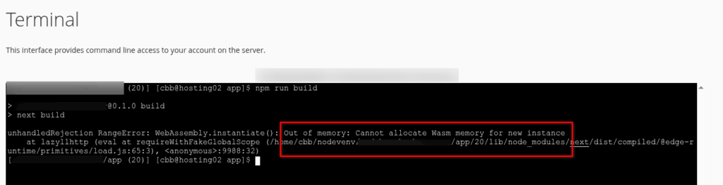 When running a npm or Node.js command via the Terminal app in cPanel, a “Out of memory” error message is returned.