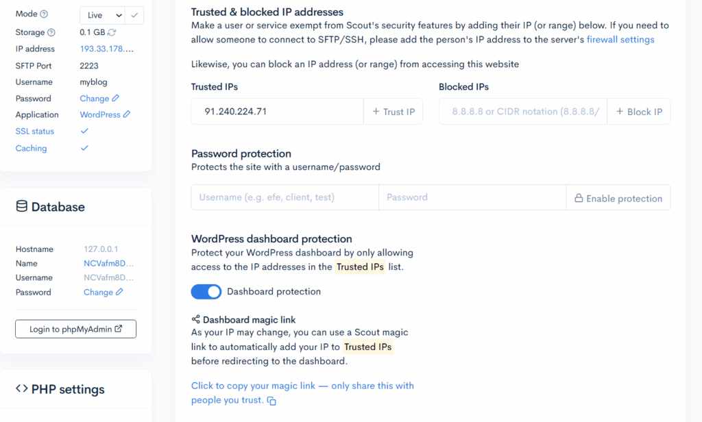 If you need to keep a WordPress website publicly accessible but prevent access to the WordPress administration area, you can enable WordPress dashboard protection in Scout Control Panel. This blocks access to the WordPress back end unless the visitor is connecting from an approved IP address.