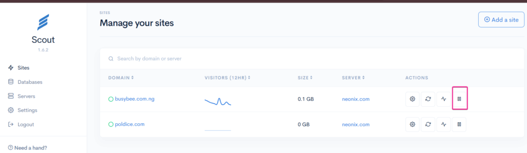 Find the site you want to manage. Look over at the buttons on the right-hand side.