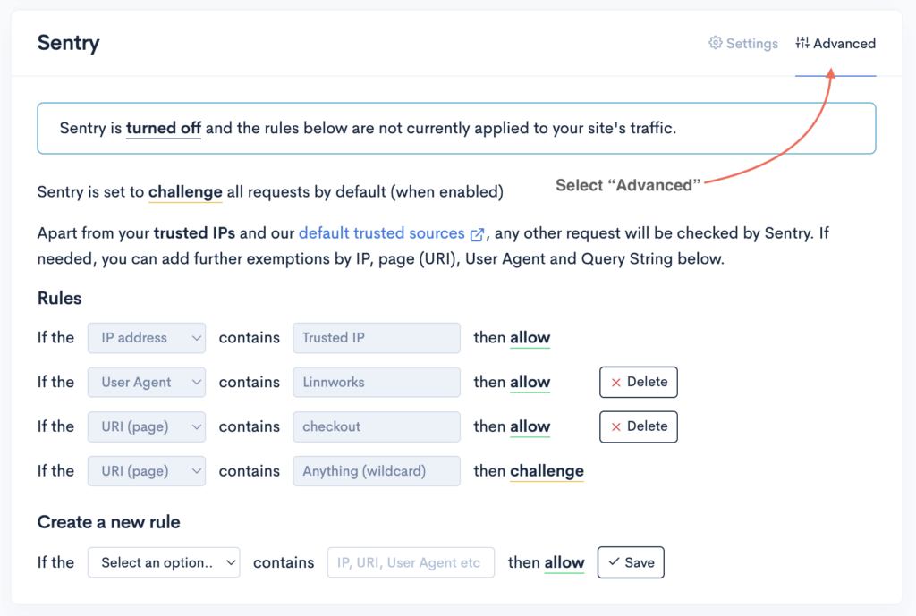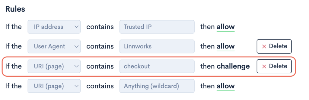 In this example, any requests to the site’s checkout would be checked by Sentry, anything else is allowed.